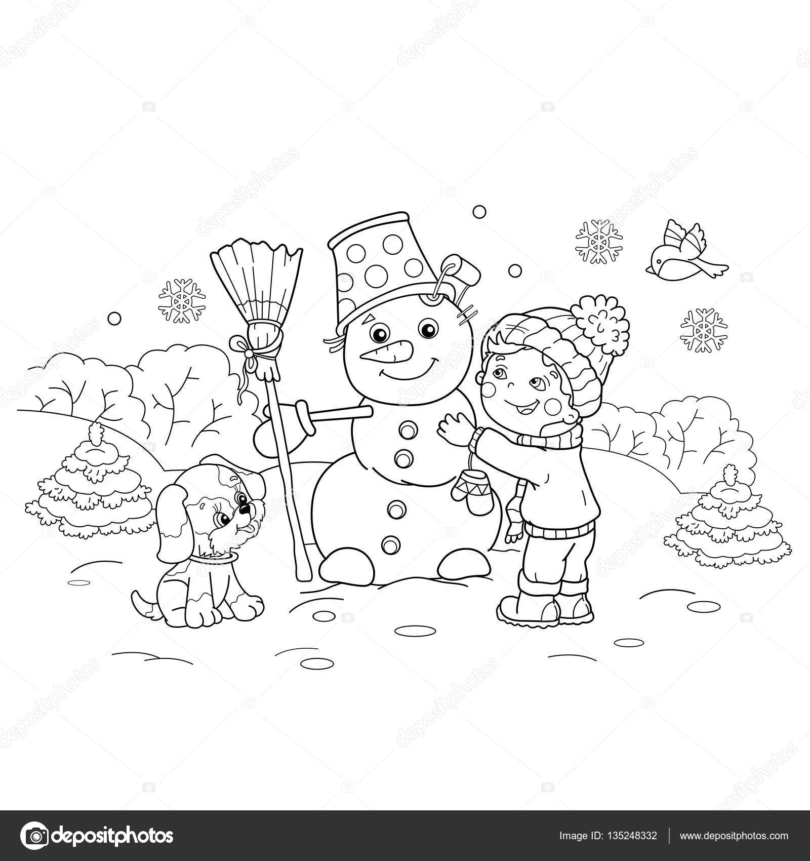Kleurplaat Pagina Overzicht Van Cartoon Jongen Sneeuwpop Met Hond